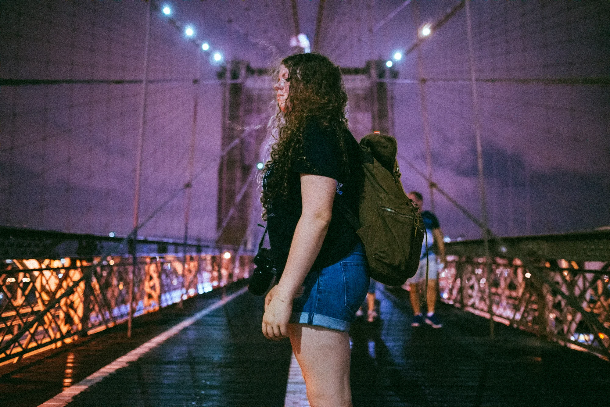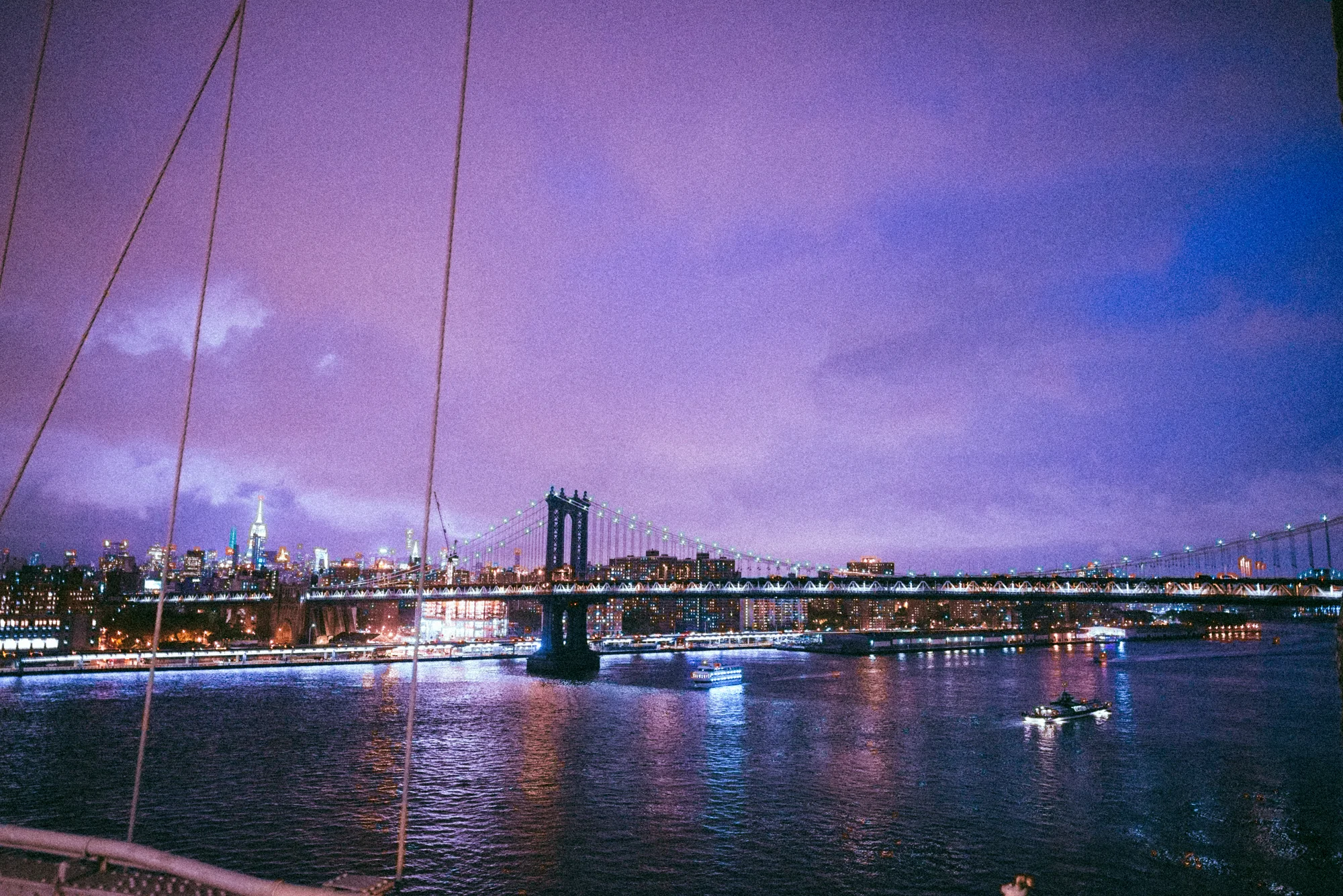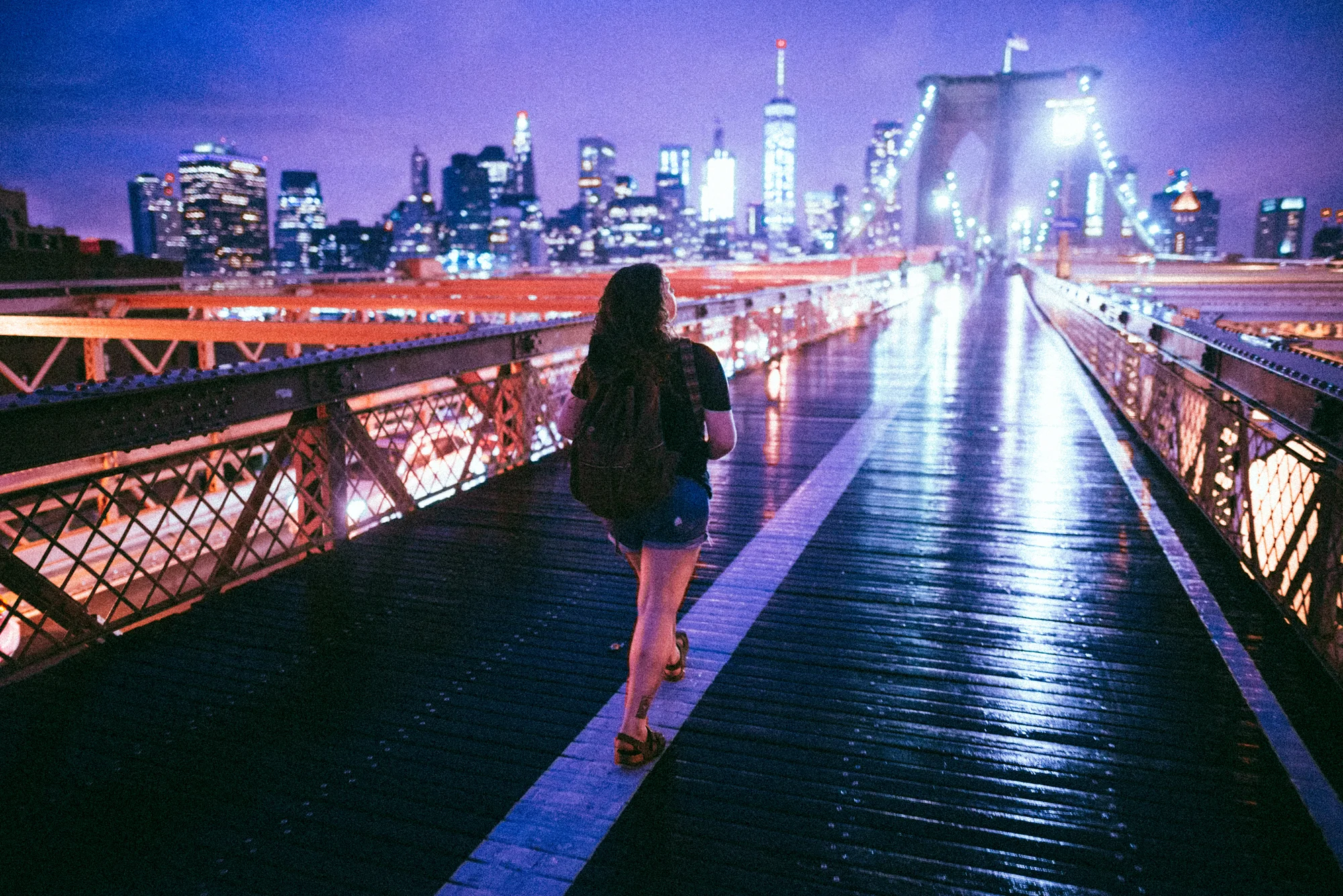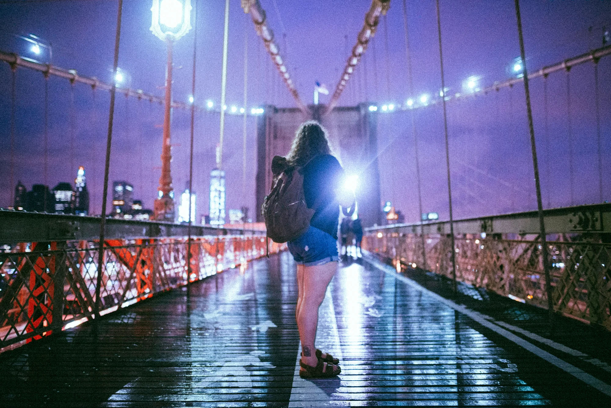 It was starting to get late and we still had two more stops to go, one being the Brooklyn Bridge. Hanna and I hopped on the subway and ended up accidentally getting off three stops ahead of the one we were meant to get off of. We contemplated getting back on the subway since it was about 3/4 mile too far, but we chose not to. It was still raining and not too many people were on the bridge walking. Ferries going under us, the skyline and it seeming to be completely silent. The view was incredible.